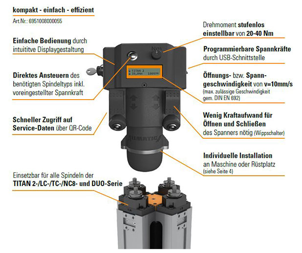 Der Helfer für die mechanische Werkstückspannung. Die maximale Öffnungs- beziehungsweise Spanngeschwindigkeit beträgt 10 mm/s.